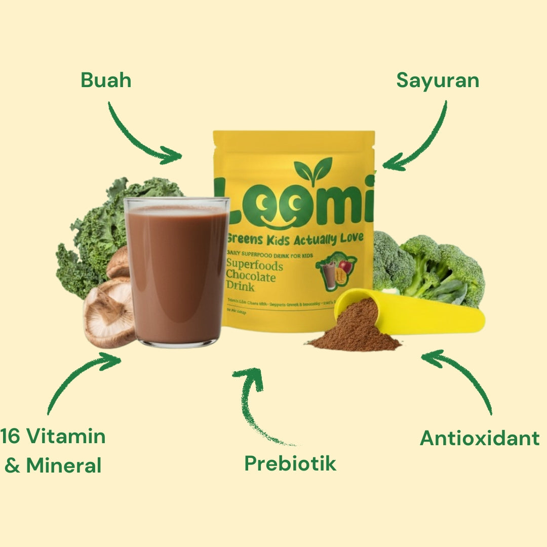 Dukung tumbuh kembang dan daya tahan tubuh anak dengan Loomi Kids.  Perpaduan 21 Superfoods, Prebiotik, serta 16 Vitamin & Mineral dalam rasa susu coklat favorit anak.
